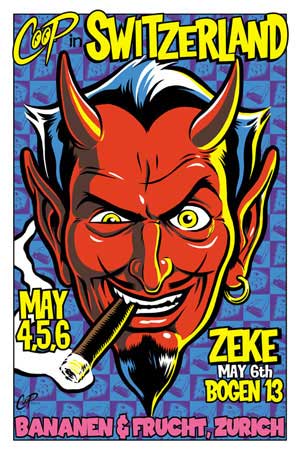 AusstellungKlang und Kleid präsentiert in der Lokalität "Bananen & Frucht" in Zürich-West am Samstag 4. Mai ab 19 Uhr den aus Bixby, Oklahoma stammenden Künstler Chris Cooper, besser bekannt unter dem namen COOP. Er wird sein neustes Buch "DEVIL`S ADVOCATE" The Art of COOP (Aperient Press ISBNSeit bald 10 Jahren zeichnet der heute 33 jährige COOP für die amerikanische Garage-Rock n'Roll Punkszene sowie das "Lowbrow" Artmovement Californiens. Eine klassische Ausbildung hatte er nie absolviert, sondern ein Job in einer Siebdruckbeschriftungsfirma hat Ihn dazu bewegt, für befreundete Punklabels und Bands, Plattenhüllen, Konzert und Tourplakate zu gestalten. In den ersten Jahren zeichnete er vorallem in schwarz/weiss da er farbenblind ist und perfektionierte so seinen Strich. Als er Robert Williams, sein grosses Vorbild kennenlernte fing er an in Farbe zu arbeiten, in Oel- und Acrylbildern sowie Siebdruckplakaten. Seine Inspirationsquellen sind vielseitig: die Pop Art eines Roy Lichtenstein oder Mel Ramos, die amerikanische Comickultur, explizit das Mad Magazine, das Tattoogenre generell (COOP hat sich am Oberarm mit einem Portrait von Alfred E. Neumann als Beatnik tätowiert :-), Zeichner wie Jack Davis, Don Martin, Georg Woodbridge und Wally Wood. Weitere Quellen sind die Hot Rod Szene (er besitzt einen 1950 Ford Deluxe Club Coupe), Ed Roth's Modelkitabbildungen, der "Ratfink", Zitate aus B-Movies des Horror-, Hammer- und Sciencefictiongenres und läppische Fernsehserien. Und stehts sind auch starke Weibsbilder mit grossen Titten und schwächlichen Männern als Gefährten à la Russ Meyer omnipresent. COOP hat so einen Weg gefunden neue Symbole und klassische Figuren für die amerikanischen Populärkultur zu kreieren. Er vergleicht dies in einem Interview mit dem was die Ramones erreicht haben. Diese sind eigentliche Karikaturen einer Rock n'Roll Band geworden und ihre Musik ist so genial weil sie so simpel ist. In diesem Sinne Hey Ho Let's Go... be outta here. KonzertZEKE, ist eine vierköpfige Band aus dem Nordwesten Amerikas. Eine weitere Seattle Kappelle? Wohl kaum... mit ihrem ultra high-speed Rock n'Roll, stehen sie da eher im Abseits und berufen sich lieber auf Einflüsse wie Motorhead, Ted Nugent und Judas Priest. Häufig werden sie auch im gleichen Atemzug mit den Dwarves und den Murder City Devils genannt. Die Songs über Satan, V8 Motoren, Horrorfilme, Drogen und Frauen sind selten länger als 90 Sekunden und durchbrechen jegliche Geschwindigkeitsbegrenzungen. 1993 wurde die Band von Sänger/Gitarrist Blind Marky Fletchtone gegründet und hat bisher 5 Alben veröffentlicht:
